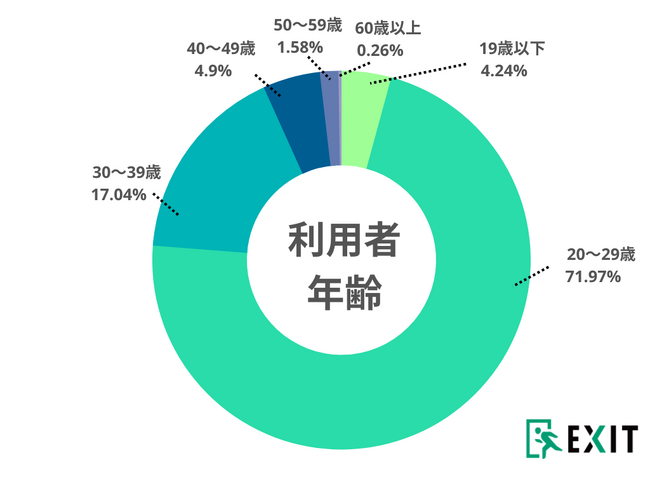 ■1.20代の利用者は全体の71.97%を占める。全年齢層の利用者の中で最も多いのが20代である。一方、60歳以上も0.26%おり、幅広い層が利用されている。