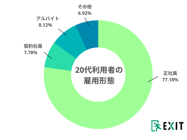 3.20代の利用者の雇用形態の内訳を見ると、正社員が最も多く77.18%に及ぶ。
