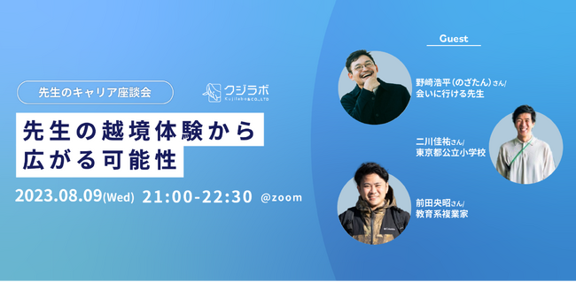 「教育のオープン化」をミッションに掲げる株式会社クジラボ(本社:福岡県福岡市、代表取締役:森實泰司、以下『クジラボ』)は、8月9日(水)21:00より、「越境体験から広がる先生の可能性」をテーマにした先生のキャリア座談会をオンラインで開催いたします。