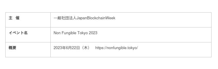 2023年6月6日、一般社団法人JapanBlockchainWeekは、経済産業省等の後援を受け「日本のブロックチェーン業界が世界へ羽ばたき健全なWEB3業界の発展にAll Japanで取り組むグローバルイベント」 である、Japan Blokchain Week 2023に株式会社テレビ朝日が、公式メディアパートナー及び、主要イベントである「Non Fungible Tokyo 2023」等のブース出展スポンサーとして参画することを決定しました。