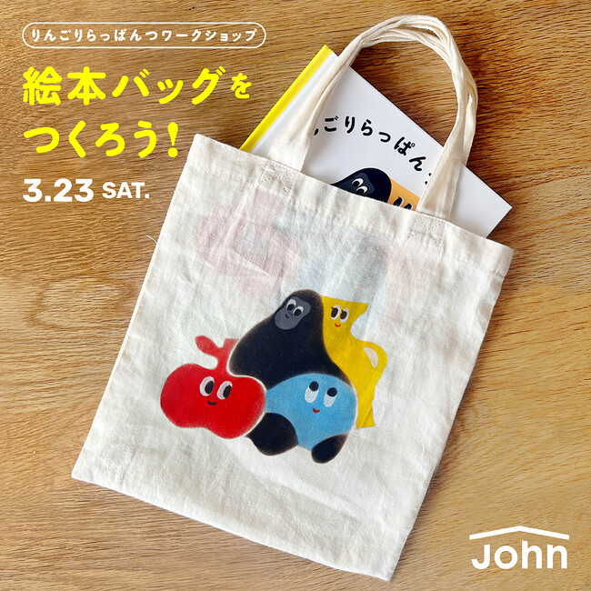 絵の具とステンシルを使って、絵本の表紙イラストのトートバッグを作るワークショップを開催します。できあがった小さなバッグに絵本を入れて、お持ち帰りください。