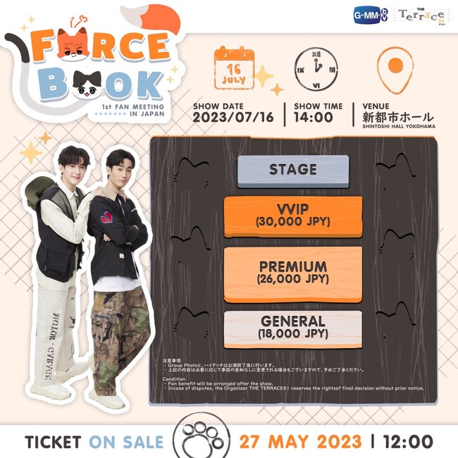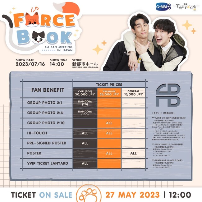 タイのテレビ会社GMMTV制作のドラマ『Enchante』や『A Boss and A Babe』で共演しているタイの人気俳優ForceBookの二人が,日本初のファンミーティングを開催!日本初となるファンミーティングは二人の歌やトーク、ゲームなど盛りだくさん!ForceBookの二人と特別な一日を過ごしましょう。