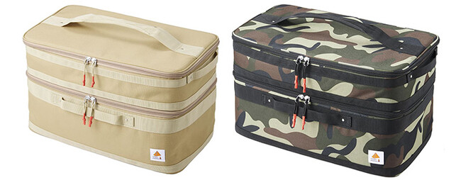 バイタルジャパンの商品群でも1番人気のベージュと、根強い人気がある迷彩の2色をご用意しました。 また、軽さにこだわりつつも、ケースがしっかりと保てるよう、下段にはカセットこんろの保護も兼ねた取り外し可能な 芯材を側面4方向に配置しています。