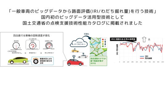 朝日航洋株式会社(本社:東京都江東区、代表取締役社長:加藤浩士、以下 朝日航洋)、トヨタ自動車株式会社(本社:愛知県豊田市、代表取締役社長:佐藤恒治)、株式会社オリエンタルコンサルタンツ(本社:東京都渋谷区、代表取締役社長:野崎秀則)、株式会社エイテック(本社:東京都渋谷区、代表取締役社長:久川真史)が4社共同で開発した「一般車両のビッグデータから路面評価(IRI/わだち掘れ量)を行う技術(以下 本技術)」※1が、このたび、国土交通省の点検支援技術性能カタログ(以下 性能カタログ)※2に掲載されました(2025年4月)。