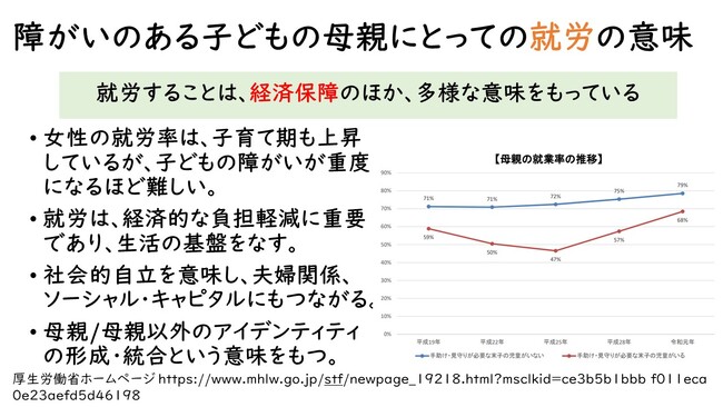 背景には、障害児家庭における母親の就労環境の厳しさがあります。私どもでは地域差はありますが、子どもを預ける場所もなく、就労できない母親の声を多く聞いてきました。