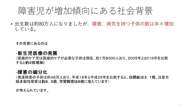 障害児家庭は年々増加傾向になります。その主な要員は医療の発展、そして、障害の細分化です。