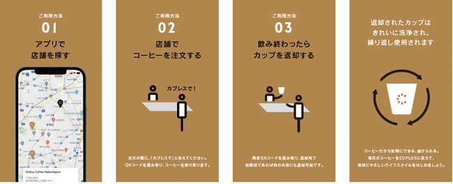ユーザーは専用のスマートフォンアプリをダウンロードしてCUPLESを利用できるショップを確認します。お店で注文の際に「カプレスで」と伝えてください。コーヒーを飲み終わったらカップをお店に返却します。カップのやユーザー利用状況の管理は利用時・返却時にアプリでQRコードを読み取るだけでできるので、気軽に利用することができます