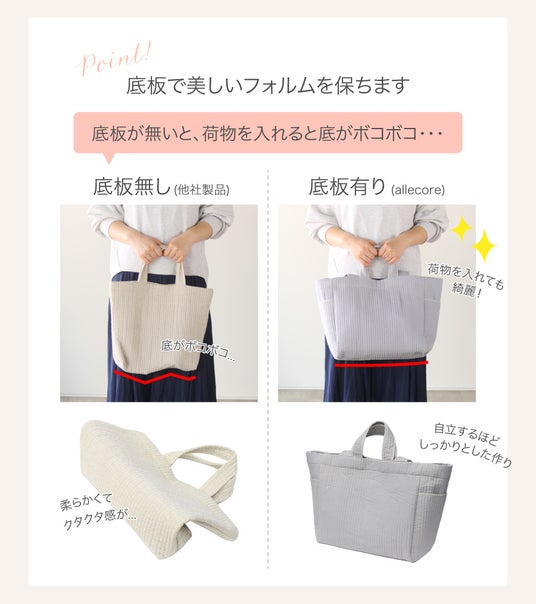 底板付きで、荷物を入れたときの型崩れを防ぎ、美しいフォルムを保ちます。
