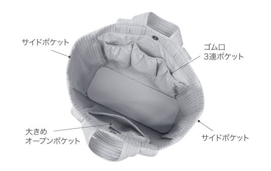 【ゴム口3連ポケット】ボトルや折り畳み傘を立てて収納できます。