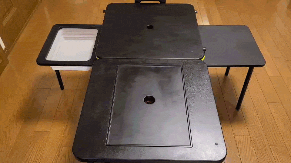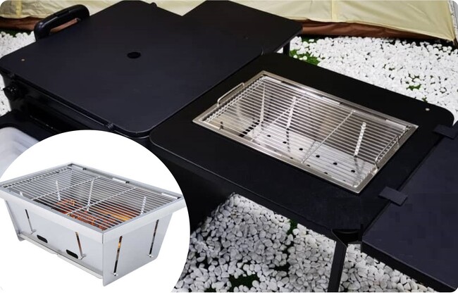 専用のグリルは、折り畳んで収納可能。普段は収納BOX内にあるから、グリルの保管場所に困りません。またテーブルには、キャンパーに人気のスノーピーク製フラットバーナー(GS-450R)がピッタリ入ります。