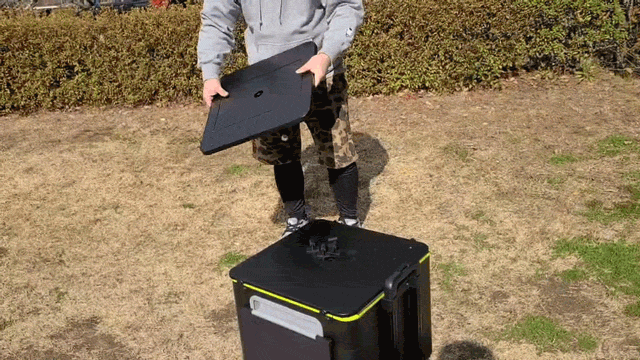 BOXに乗せてあるテーブルをSAFETY LOCKをはずして下ろし、蓋を開けてポールなどのツールを取り出します。レイアウトが自由自在に決められるから、1人用キャンプや災害時の自炊にも役立ちます。
