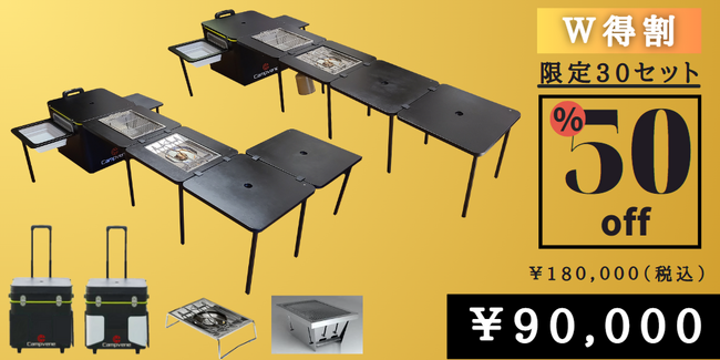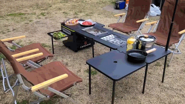 テーブルやコンロの配置は自在に変形OK。ソロキャンプでも、大人数の野外飲み会など、さまざまなシーンで利用できます。