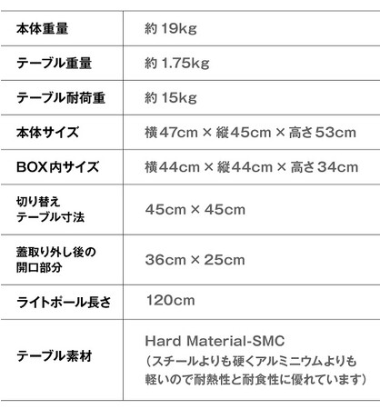 全てのキャンプテーブルにHard MATERIAL-SMCを採用耐熱性(※試験データあり)はもちろん、スチールより硬くアルミニウムより軽いので丈夫で耐食性に優れお手入れも簡単