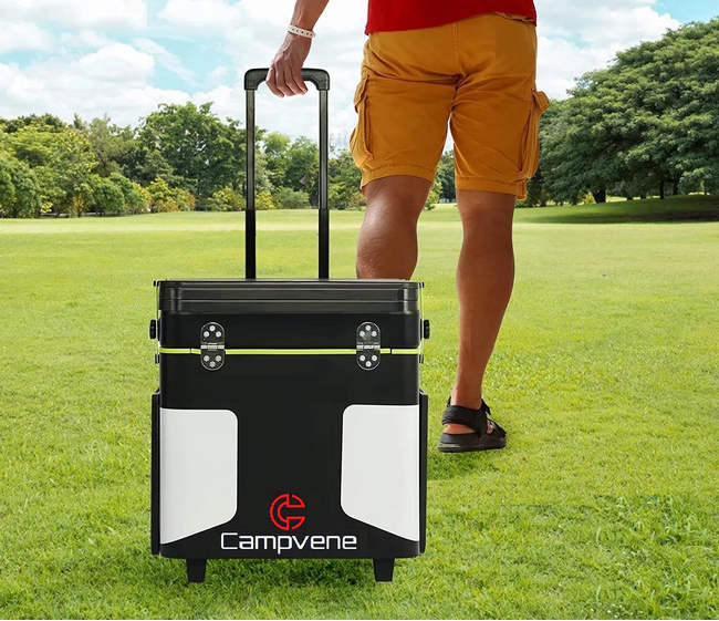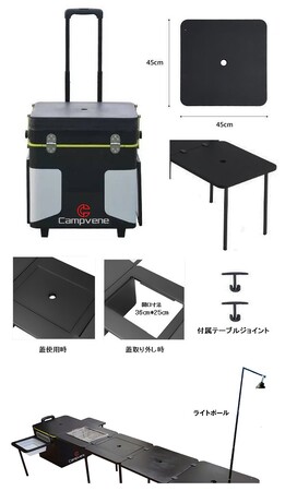 EAT-BOXはテーブルやコンロをコンパクトに収納OK!65Lの大容量でかつ軽量。大量の食材を収納しても、キャスター付きだから、女性でもラクに持ち運び可能です。