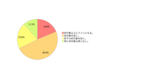 Q6の結果より、合計88.5%の学生が企業版ふるさと納税を通して寄付活動を行っている企業に好印象を抱くと回答しており、その内18.8%の学生は「好印象以上にファンになる」と回答。これより、「企業版ふるさと納税」を通した寄付活動は、企業にとって学生のファンを作り出す手段にもなり得ると言えます。