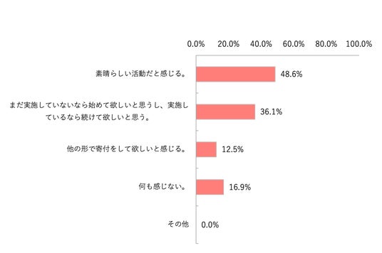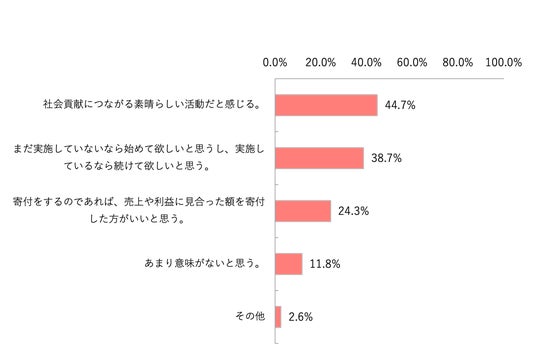 Q3の結果より、企業の寄付活動に関しては44.7%の学生が「社会貢献につながる素晴らしい活動だと感じる」、38.7%の学生が「まだ実施していないなら始めて欲しいと思うし、実施しているなら続けて欲しいと思う」と回答しているため、企業の寄付活動に対する関心度は非常に高いと言えます。