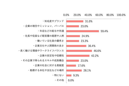 Q1の結果より、上位から順に、「年収などの給与や待遇(59.4%)」、「長く働ける環境やワークライフバランス(46.6%)」「企業の安定性や信頼性(42.2%)」となっており、転職によるスキル・年収UPが浸透している昨今においても、最初に就職する企業においては、長期雇用に関わる要素を重視していると考えられます。