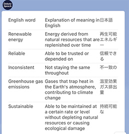 Logic practiceまたはDebateを行った後に、関連する英単語、その説明、日本語での意味がワードリストに表示されます。