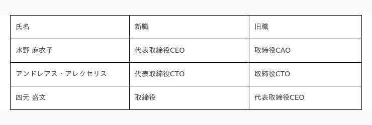 AlpacaTechの代表取締役は四元が退任し、水野 麻衣子が代表取締役CEOに、アンドレアス・アレクセリスが代表取締役CTOに就任し、共同代表体制となります。四元と甲斐は取締役として、引き続きAlpacaTechの経営に関与いたします。