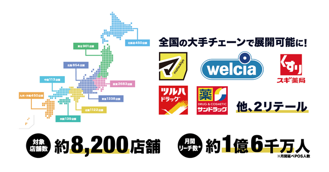 主要ドラッグストアを中心に「リテール横断型」広告媒体として最大規模のオフラインメディア・ネットワークに成長。マツモトキヨシ、ウエルシア薬局、スギ薬局、ツルハドラッグ、サンドラッグ他 ※1で掲出が可能に