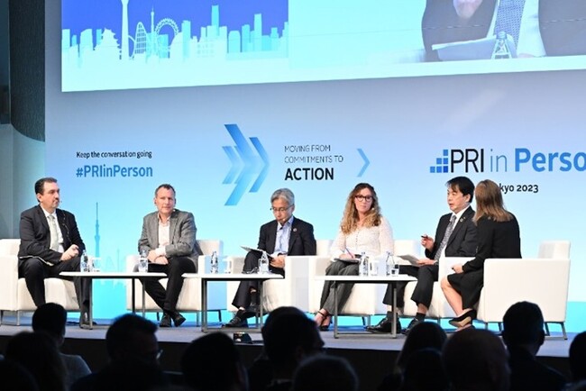 (左から) トニー・ゴールドナー(TNFDエグゼクティブ・ディレクター)、ヤン・ラスムッセン(PensionDanmark ESG・サステナビリティ ヘッド)、菱田 賀夫(三井住友トラスト・アセットマネジメント代表取締役社長)、ヘザー・ライト(WWFマーケット・インスティテュート マーケット担当バイス・プレジデント)、上山健一(Kao株式会社ESG部門バイス・プレジデント)、モデレーター タムシン・バラード(PRIチーフ・インベスター・イニシアチブ&コラボレーション・オフィサー )