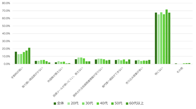 続いて、現在の投資・資産運用での不満を聞いたところ、証券会社選びで重視すること同様「手数料(16.1%)」が「特にない」を除いた具体的な不満の中で最も高い結果となりました。手数料への不満は年齢が上がるほど高くなり、最も高い60代以上で21.3%、反対に最も低いのは20代で12.8%、30代も13.2%という結果となりました。