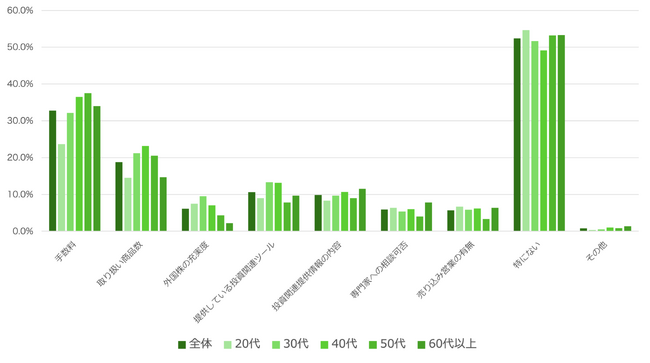 次に、証券会社を選ぶ際に何を一番重視するか聞いたところ、全体の52.4%と約半数は「特にない」と回答しました。具体的に重視するポイントとして一番多かったのは「手数料」で、全体平均で32.8%という結果となりました。