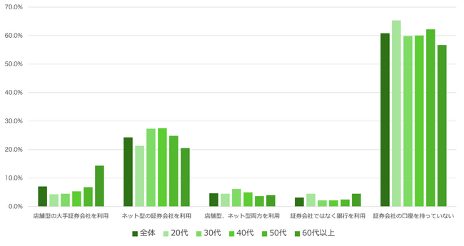 続いて、現在利用している証券会社について聞いたところ、全体では「ネット型の証券会社」が24.3%と、証券会社の口座を持っていない人を除くとトップで、年代による差はあまりありませんでした。一方、店舗型の大手証券会社を利用している割合は、20代~50代までは1桁前半から半ばなのに対し、60代以上は14.3%と高く、他年代の3~4倍程度の方が利用していることがわかりました。