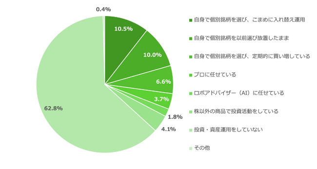 はじめに、現在の投資・資産運用の仕方について聞いたところ、「自身で個別銘柄を選び、こまめに入れ替え運用(10.5%)」、「自身で個別銘柄を以前選び放置したまま(10.0%)」、「自身で個別銘柄を選び、定期的に買い増している(6.6%)」、を合わせた『自身で銘柄を選んで運用している人』は27.1%と全体の約3割にのぼり、投資・資産運用している人だけで見たときには、その内73.6%にのぼります。プロに運用を任せ(3.7%)たり、ロボアドバイザー(AI)に任せ(1.8%)ている人と比べると、圧倒的に多い状況でした。