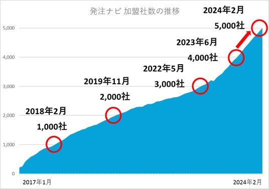発注ナビ株式会社(本社:東京都千代田区、代表取締役社長:浅井英行 以下、発注ナビ)は、運営するシステム開発案件紹介サービス「発注ナビ( https://hnavi.co.jp/ )」に加盟するシステム開発会社数が、2024年2月末時点で5,000社を超えたことを発表します。「DX白書2023」(独立行政法人情報処理推進機構 *1)によると、2022年度の国内システム開発会社の企業数は19,130社であり、4社に1社を超える26%が発注ナビに加盟していることになります。足元では8か月で1,000社の増加となり、ペースが加速しています。