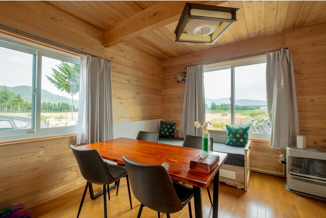 天井から床まで、いたるところから木のぬくもりが感じられるログハウスならではの内装は、ゆっくりと過ごす時間を一層心地よいものにしてくれます。窓からは周囲の農村風景が広がり、美しい景色が室内の雰囲気と見事にマッチします。