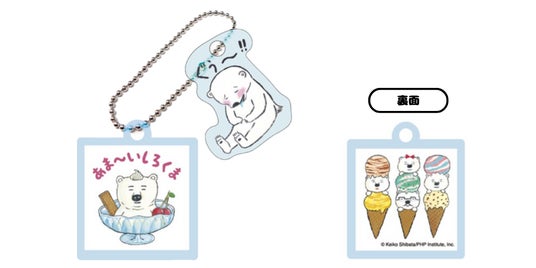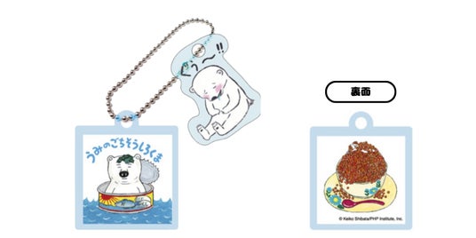 今回は第1作の「おいしそうなしろくま」から第4作の「うみのごちそうしろくま」のイラストをセレクトし、アクリルキーホルダーとして初めてカプセルトイで発売。全部のキーホルダーに、おなかをすかせたしろくまのミニチャームが付属しており、シークレット柄も合わせて5種類を用意。