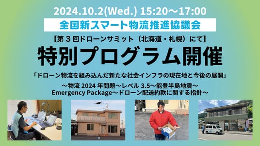 全国新スマート物流推進協議会(東京都渋谷区、会長:竹中貢 北海道上士幌町長 以下 本協議会)は、2024年10月1日(火)・2日(水)に、札幌コンベンションセンターにて開催される「第3回ドローンサミット」にブース出展すると共に、展示会内の企画として10月2日(水)に「ドローン物流を組み込んだ新たな社会インフラの現在地と今後の展開」と題した特別プログラムを開催いたします。
