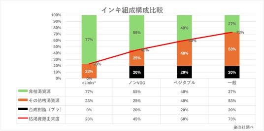 上グラフの通り、eLinks(R)は樹脂や石油系溶剤(鉱物油)を一切使用しないことで、枯渇資源由来の成分を最大50%(一般対比)低減させています。この数値からも、eLinks(R)が最高位の環境配慮型インキであることが分かります。