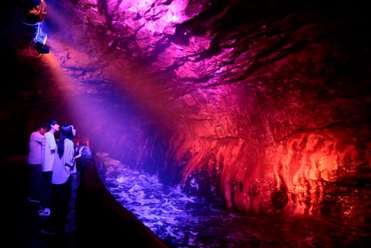 洞窟内の展望台では、ライトアップされた岩肌や波が夜の神秘的な雰囲気を演出。
