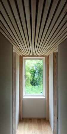 鳥取県における建築物で、温熱性能の最高点を目指しました。窓からの日射取得等も厳密に考慮し、建築物の省エネルギー性能で最も厳しい基準の一つである独パッシブハウス研究所の認定を取得。8畳用ダクトエアコン1台を換気経路に接続し、全館冷暖房を実現しています。Ua値0.18、C値0.1。