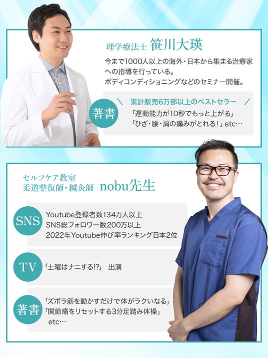 この度、理学療法士YouTuber笹川ひろひで(登録者数19.6万人)とセルフケア教室nobu先生(登録者数139万人)がYouTubeで初共演し、ふしぶしをケアするマッサージクリームを共同開発。