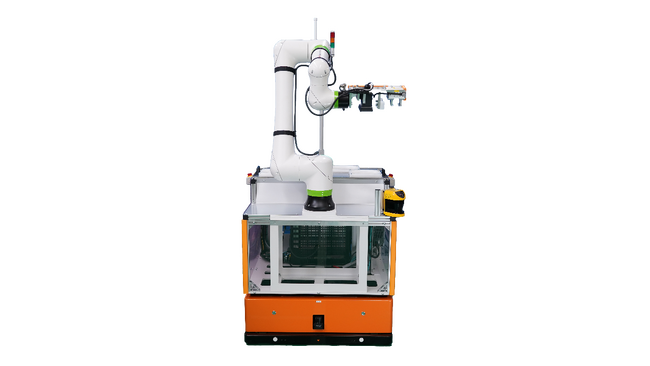 AGV(無人搬送車)にロボットアームとビジョンを搭載した、人と協働作業が可能な移動型搬送ロボットの事です。ハンド部分は用途に応じてカスタマイズが可能になっており、自動給電を行うことで24時間の稼働も実現。また、アーム部分に搭載された「iRVison」がマーカーを読み込んで三次元補正を行ない、その精度は±1mm以内に位置補正が可能。