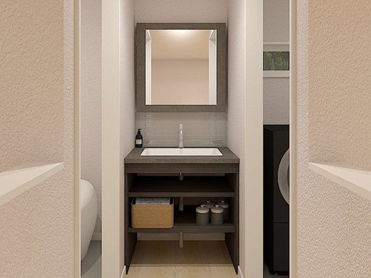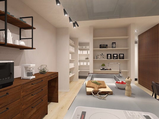 シンプルながら目を引く個性的な外観は、軒と袖壁で構成される一味違ったフレーム。住宅内部は玄関から収納、パントリーへと続く機能的な動線計画を採用し、さらに2階に浴室と独立した洗面所を計画。脱衣所を兼ねたランドリールームなど、新しい暮らし方のヒントが詰まったプランニングです。