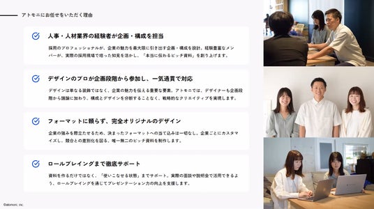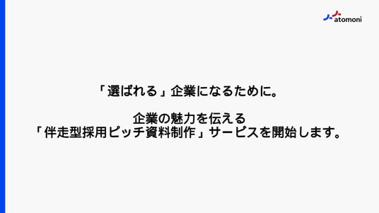 2025年3月4日(火)、株式会社アトモニ(本社:広島県、代表取締役:栗田 康二)は、企業の採用活動を支援する「伴走型採用ピッチ資料制作」サービスの提供を開始いたしました。本サービスは、企業が優秀な人材を獲得するために欠かせない採用ピッチ資料を、企業に合わせて設計・制作し、採用活動における発信力向上を支援するものです。
