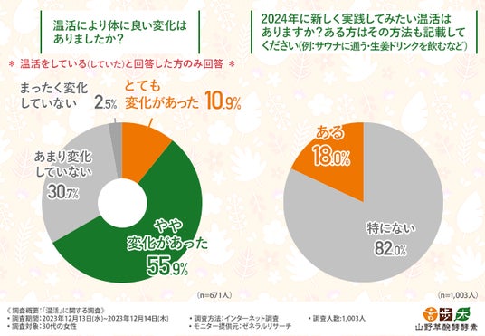 次に「温活により身体に良い変化はありましたか」と質問したところ、『とても変化があった(10.9%)』『やや変化があった(55.9%)』という回答結果になりました。約7割の方が温活により身体に良い変化があったことが明らかになりました。「2024年に新しく実践してみたい温活はありますか?ある方はその方法も記載してください」と質問したところ、約2割の方が『ある (18.0%)』と回答しました。■2024年に実践してみたい温活を教えてください