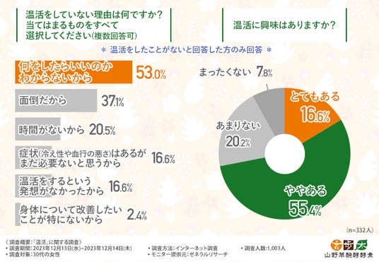 「温活をしていない理由は何ですか、当てはまるものをすべて選択してください(複数回答可)」と質問したところ、『何をしたらいいのかわからないから(53.0%)』という回答結果になりました。また、「温活に興味はありますか?」と質問したところ、『とてもある(16.6%)』『ややある(55.4%)』という回答結果になりました。温活をしていない方の約7割の方が温活に興味があることが示されました。