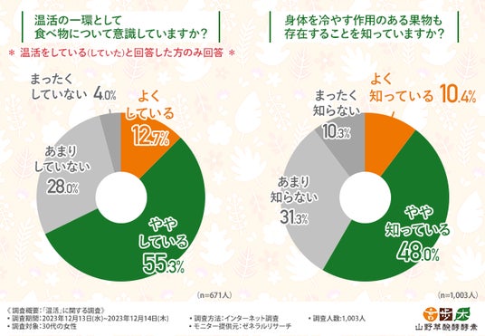 そして、「温活の一環として食べ物について意識していますか」と質問したところ、『よくしている(12.7%)』『ややしている(55.3%)』という回答結果になりました。約7割の方が温活の一環として食べ物を意識していることが明らかになりました。そこで「身体を冷やす作用のある果物も存在することを知っていますか?」と質問したところ、『よく知っている(10.4%)』『やや知っている(48.0%)』という回答結果になりました。