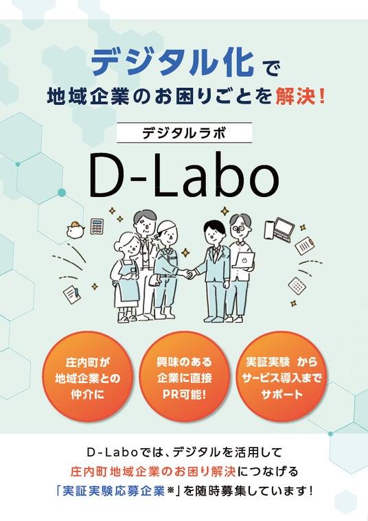 山形県庄内町(住所:山形県東田川郡庄内町余目字町132番地1、町長:富樫透)は、地元住民や事業者の多種多様な困りごとに対し、町全体をデジタル研究所として実証実験に取り組みながら解決を図る企業を募集しています!