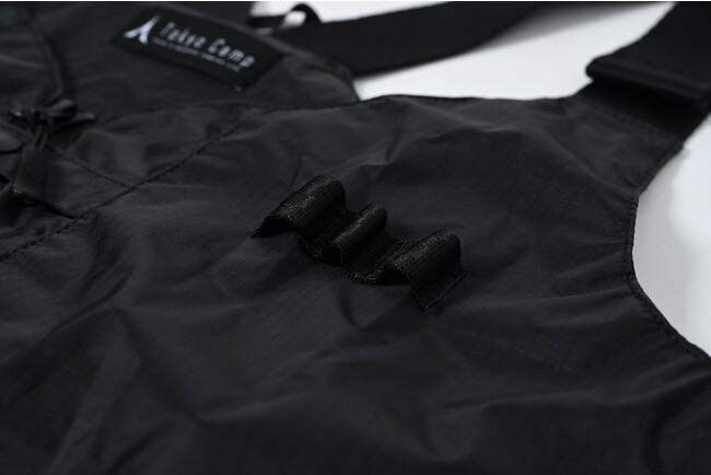 フロントにある2つのポケットには収納物の落下を防ぐスナップボタンが付いています。左胸部にはサングラスやキャンプギアを掛けられるギアループ、右下腹部には留め具の付いたDカンが備えられています。また、ショルダーベルト付きでお好みのスタイルに合わせて調整いただけます。アウトドアシーンはもちろん、普段使いとしても合わせやすい汎用性の高いアイテムです。
