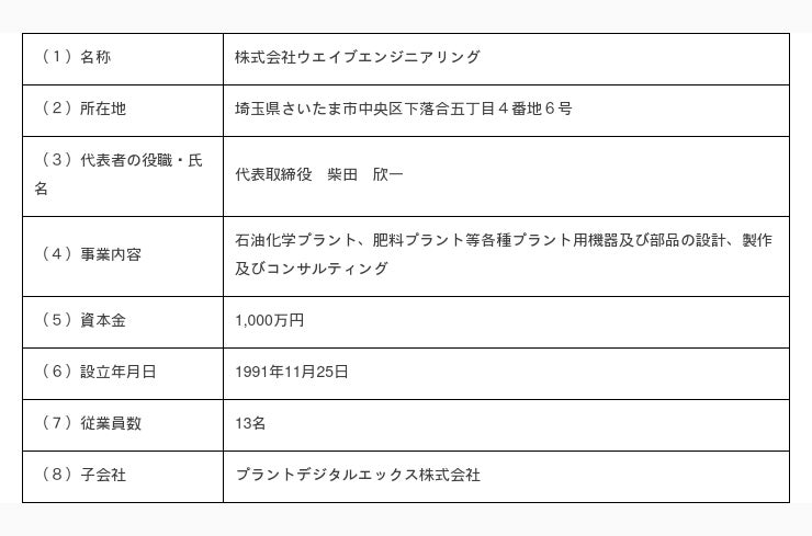 総合機械商社の第一実業株式会社(本社:東京都千代田区、代表取締役 社長執行役員:宇野一郎、以下「当社」)は、下記のとおり、2023年7月31日付で株式会社ウエイブエンジニアリング(本社:埼玉県さいたま市。代表取締役:柴田欣一、以下「ウエイブエンジニアリング」)の株式を取得いたしました。これによりウエイブエンジニアリングは当社グループに参画することをお知らせいたします。