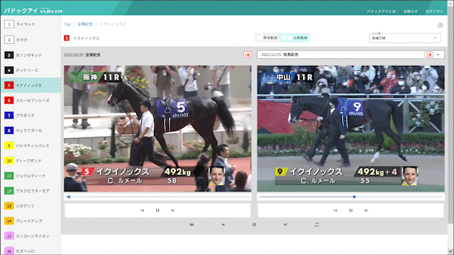 これにより、馬毎にパドック動画を何度も見る事ができ、さらに過去の動画と並べて比較再生することで馬の状態チェックをより深く楽しめるようになりました。