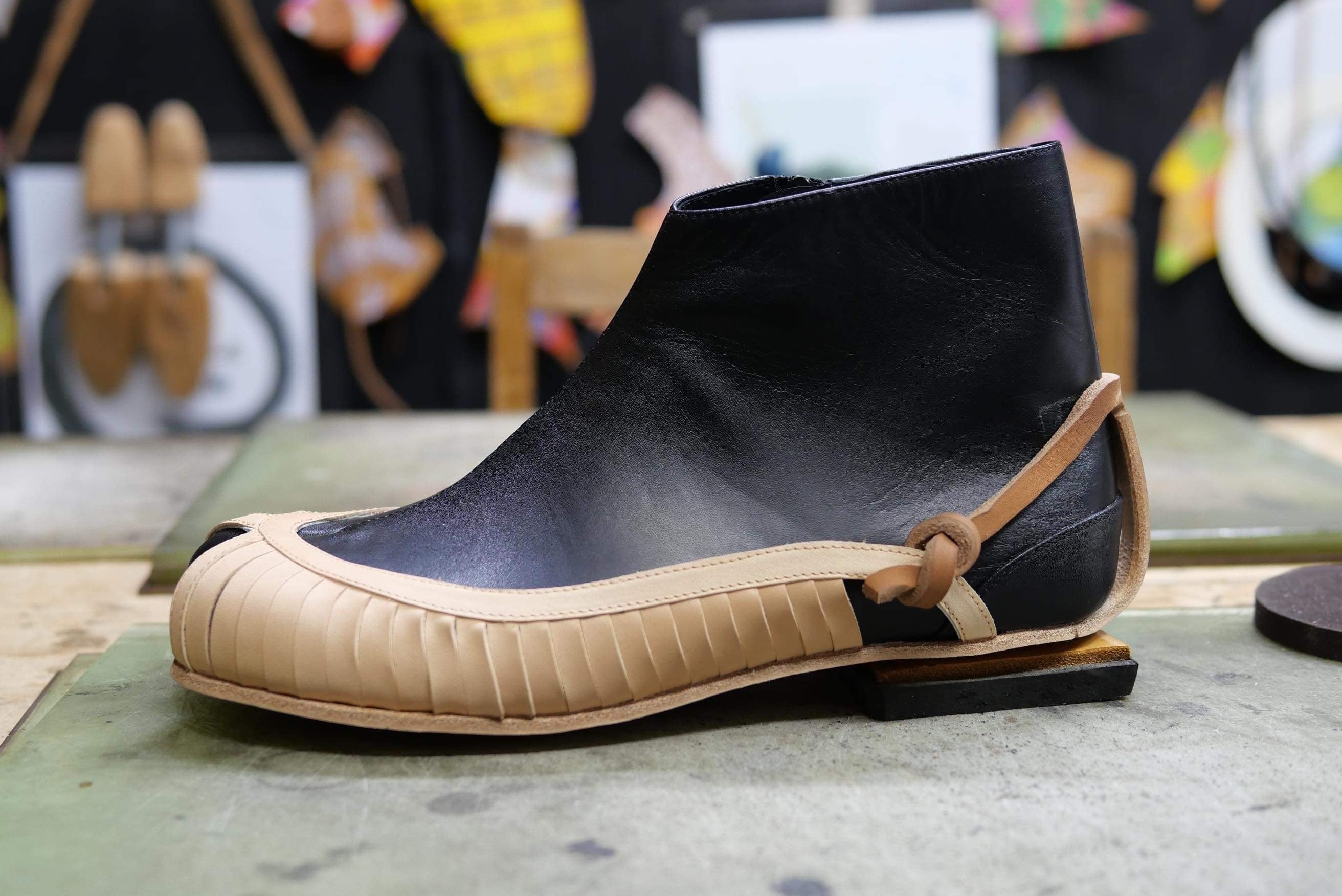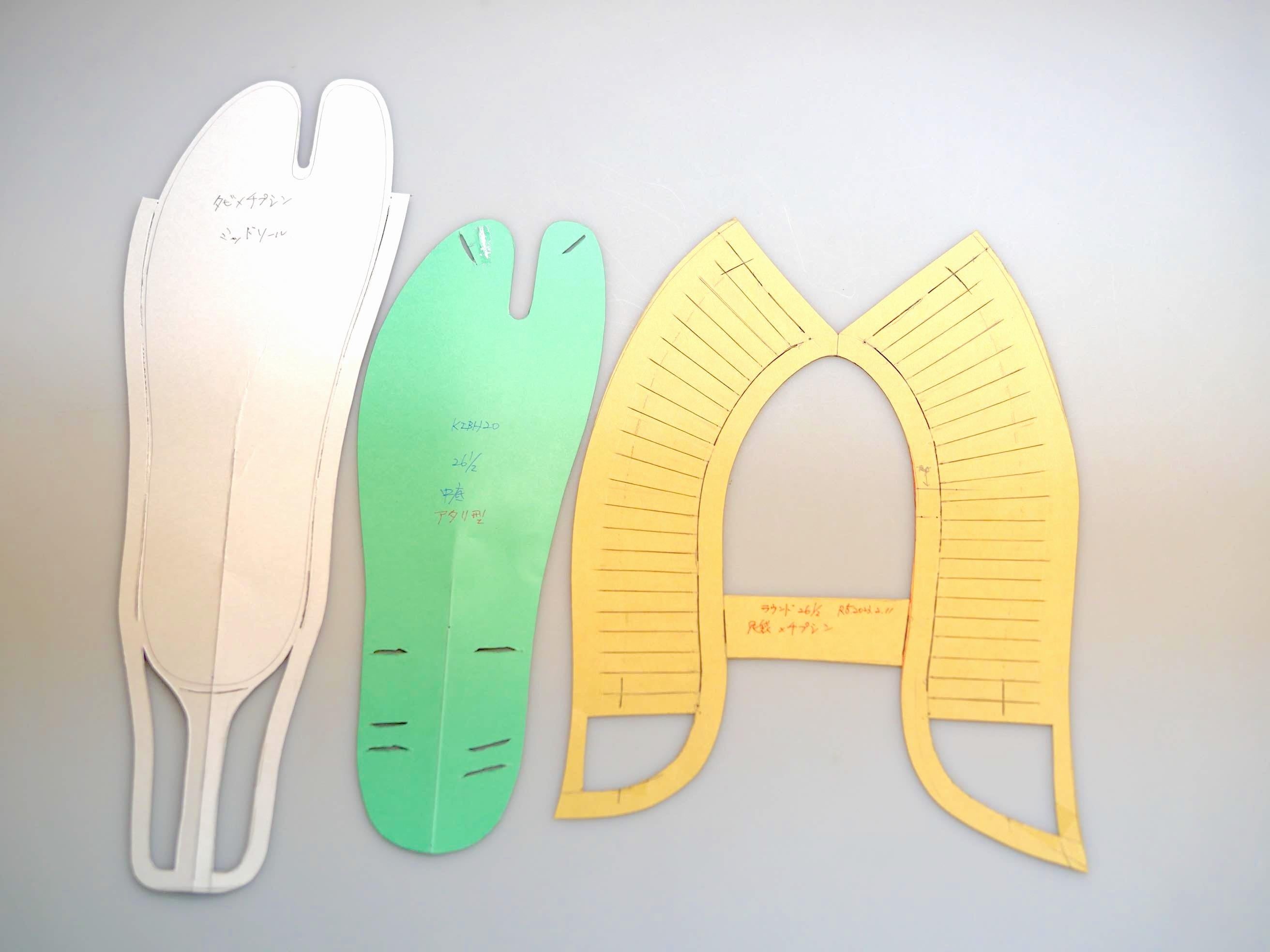 靴底に使用する革底からシームレスに革紐を取り回し、チプシンの縦型のスリット部分の端とノットを作ることで、装飾的な意味だけではなく、足袋のシルエットを足の動きに合わせて支える構造的な仕組みを開発しています。試作段階で検証を重ね、細部の具体的なシルエットに至るまで型紙を詰めました。