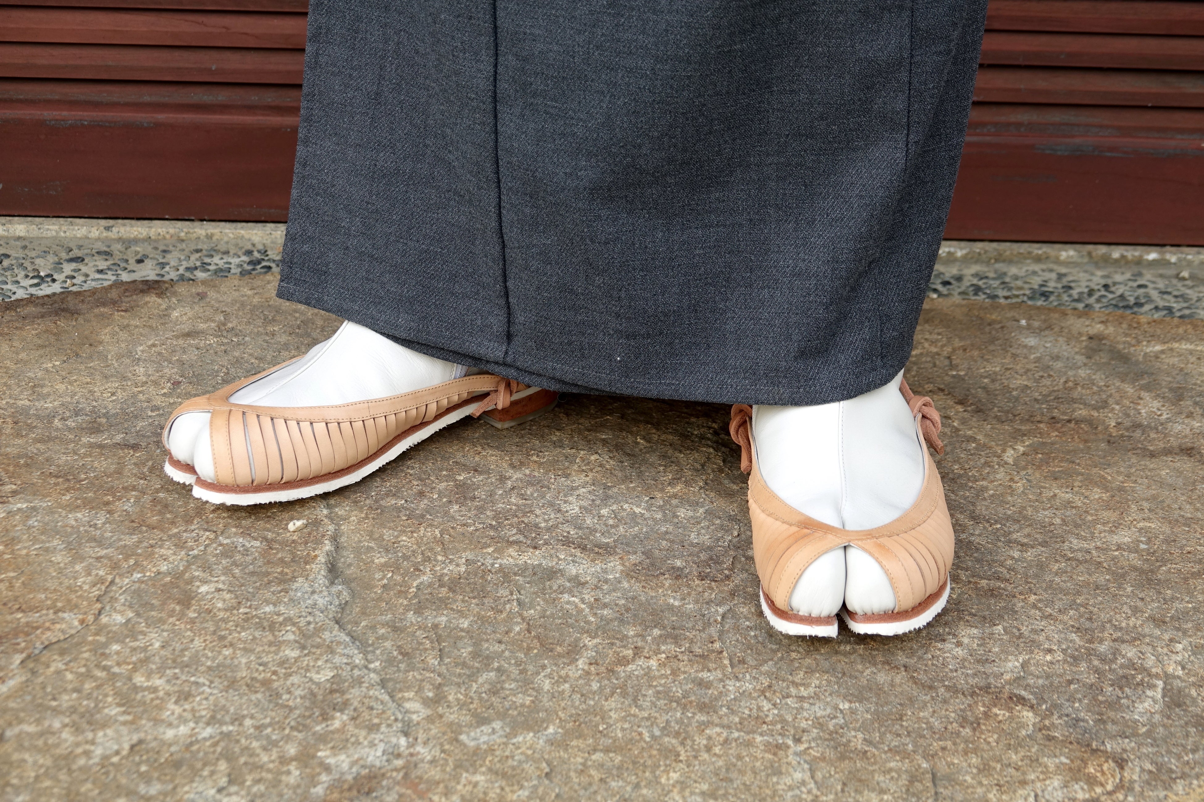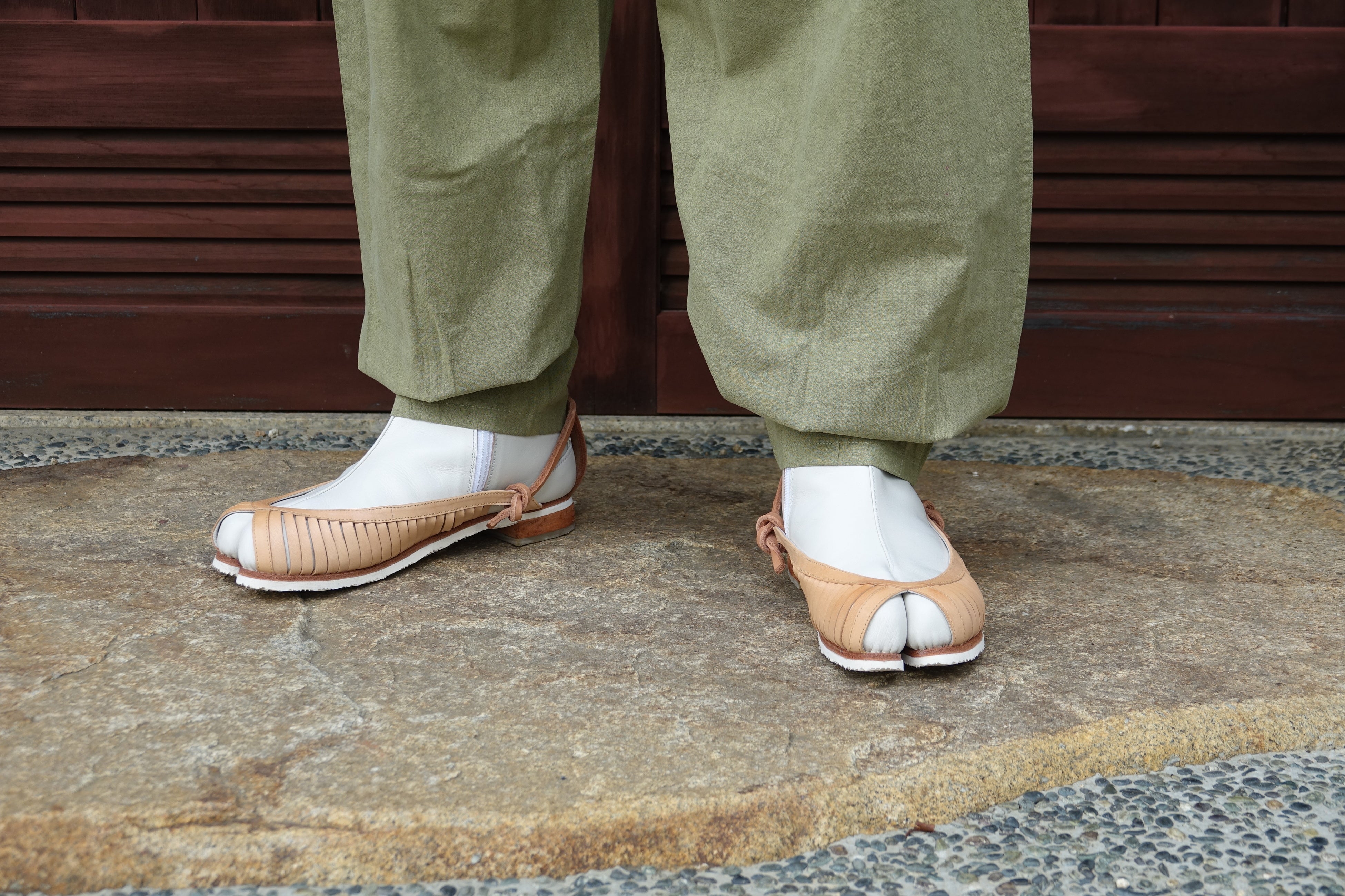 剣道を20年以上専門でやってきた作り手だからこそ掲げられるテーマだと確信し、日本に古来から伝わる形を現代の生活に合うようにデザインに昇華し、革靴の技術と合わせながら製作をスタート。ヌメ革を基本素材とし、目指すのは畳に素足が触れた時の開放的な感触の心地よさ。