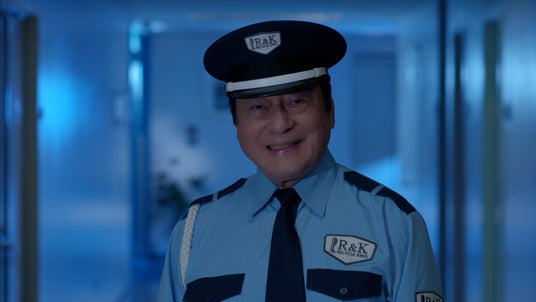 高橋英樹さんは警備員役で登場し、店頭デビューを控えたお品物たちをやさしく見守ります。